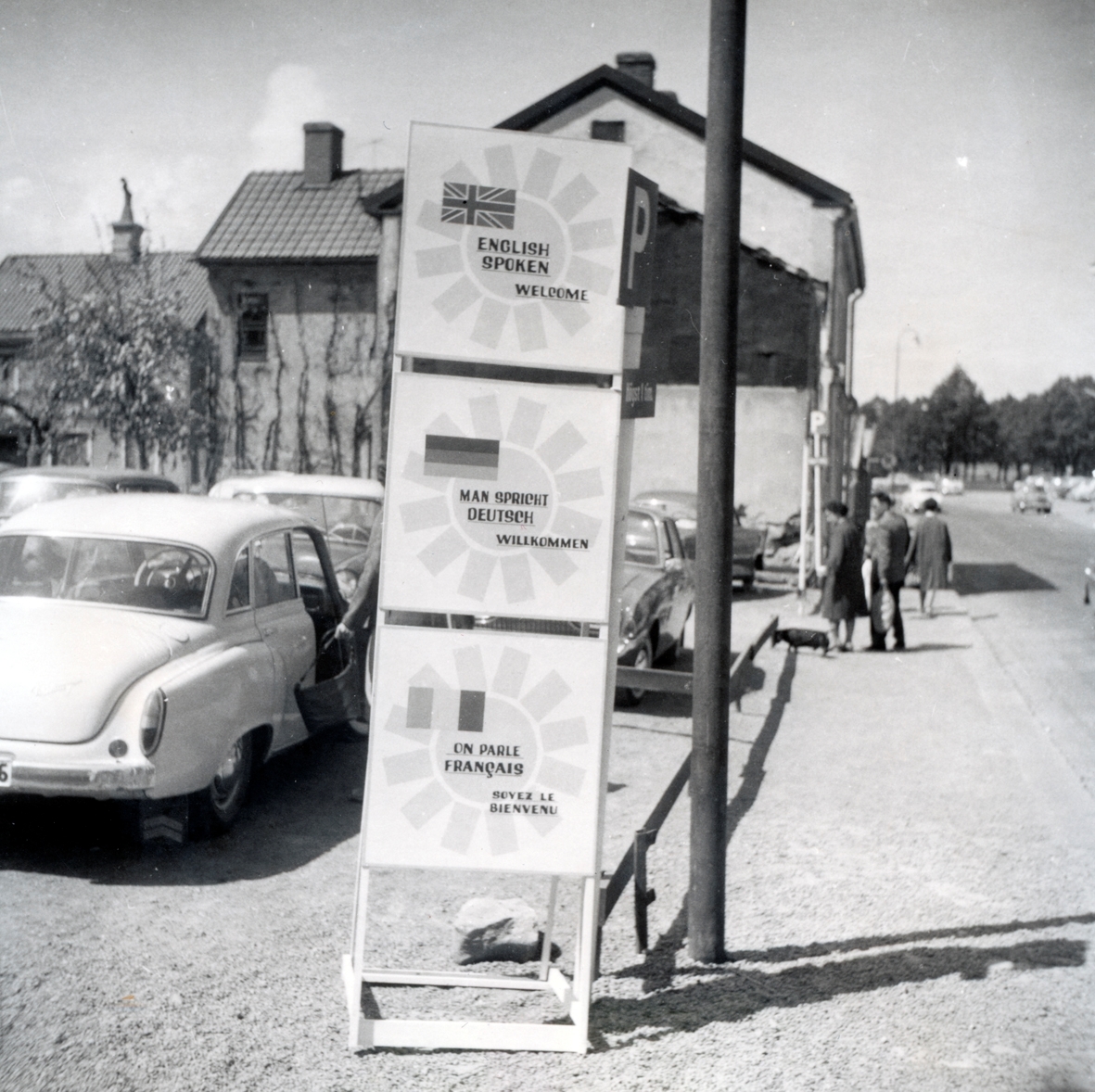 Välkomstskyltar för utländska turister [med text på engelska, tyska och franska] vid parkeringsplatsen på Västra Sjögatan.