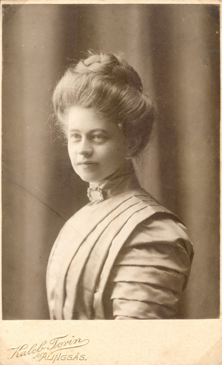 Bröstbil, halvprofil av Ellen Warholm i stort, uppgummat hår och halvljus klänning med många veck, brosch i halsen.