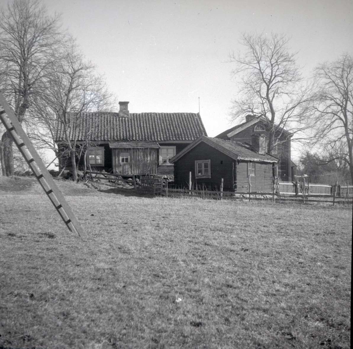 En flygelbyggnad och en bod i Hagnebo samt gaveln på en byggnad och en stege i förgrunden.