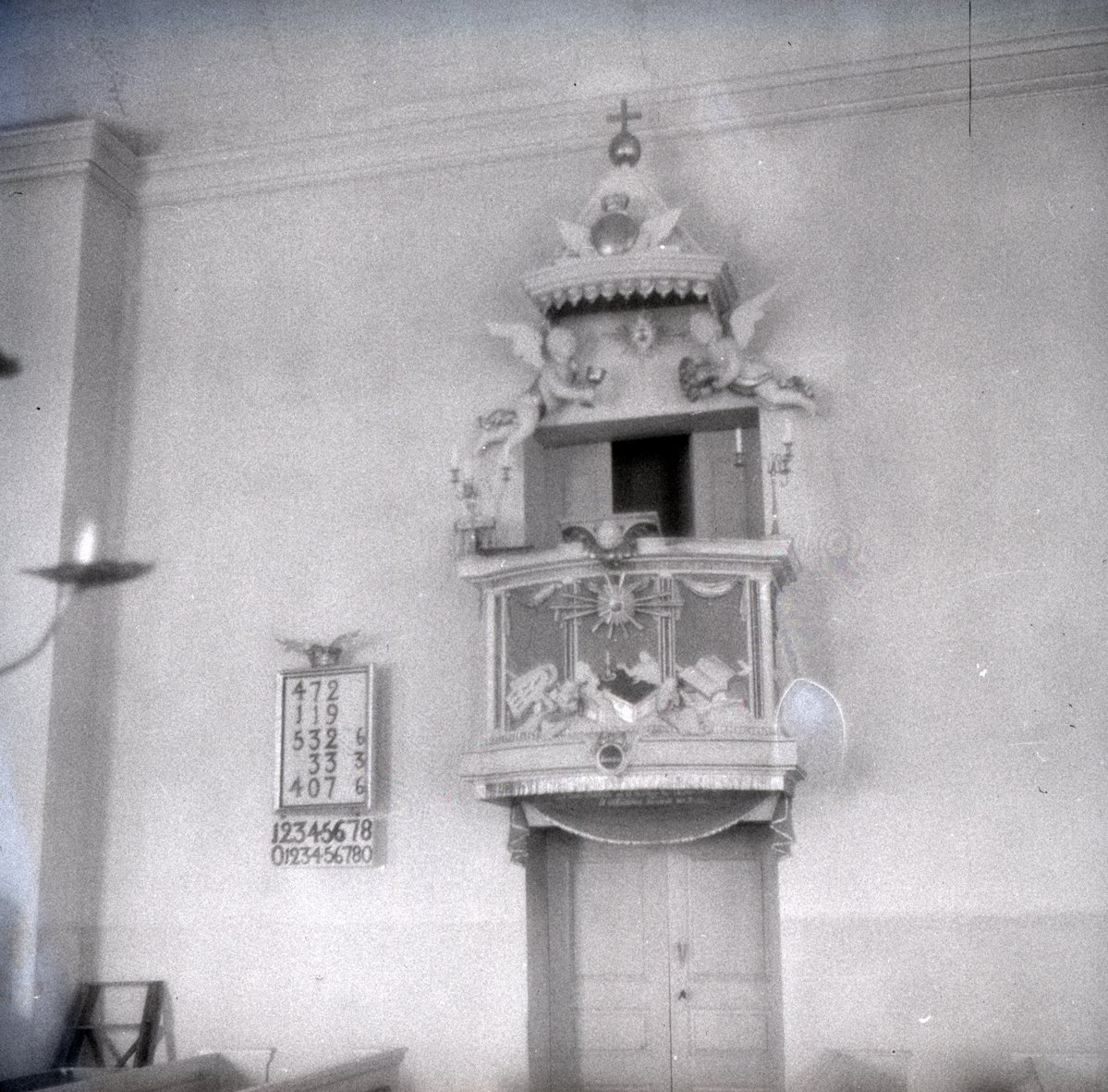 Predikstolen i Vena kyrka. I bilden syns även en baldakin och psaltartavla.