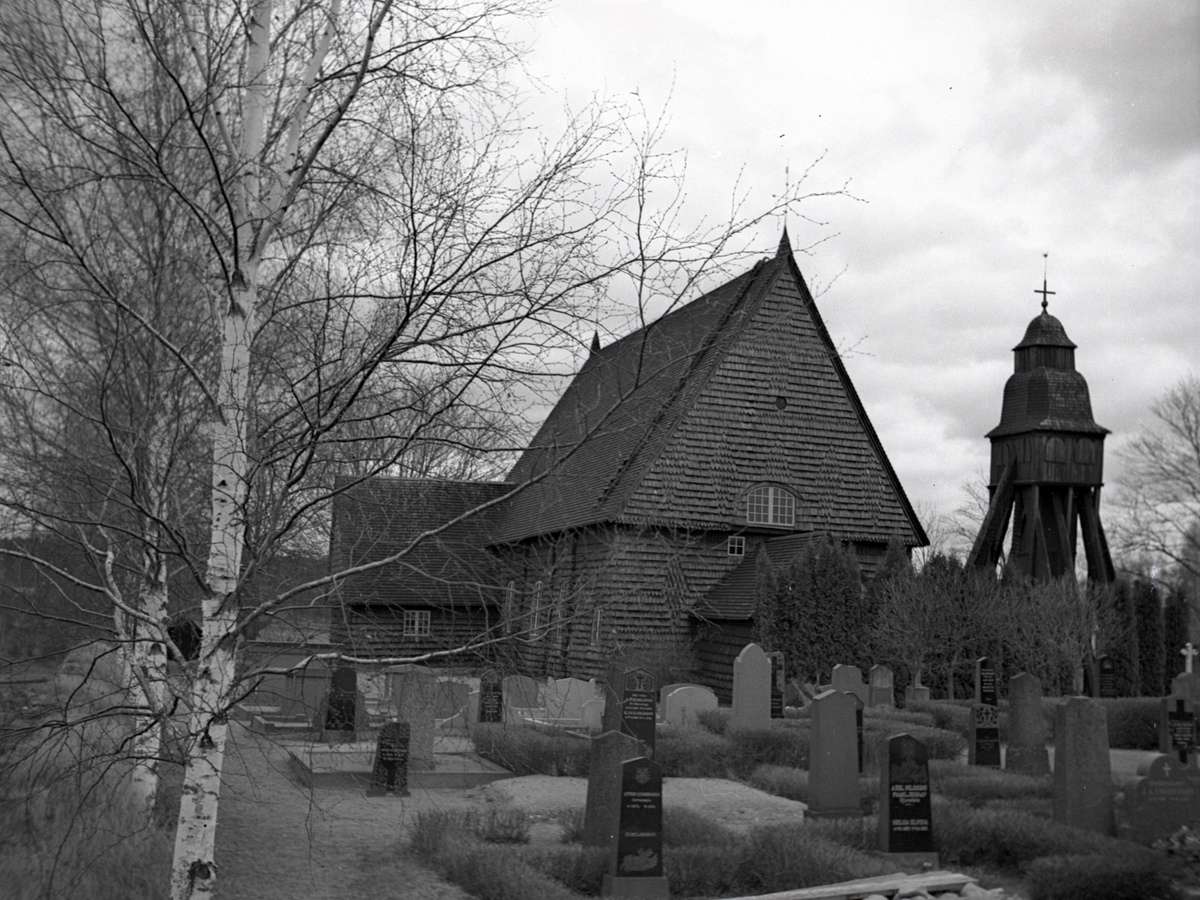 En klockstapel, kyrkogård och kyrka. Djursdala kyrka.