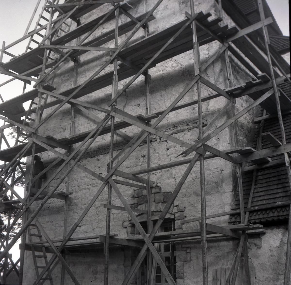 Hossmo kyrka, exteriör med byggnadställningar.