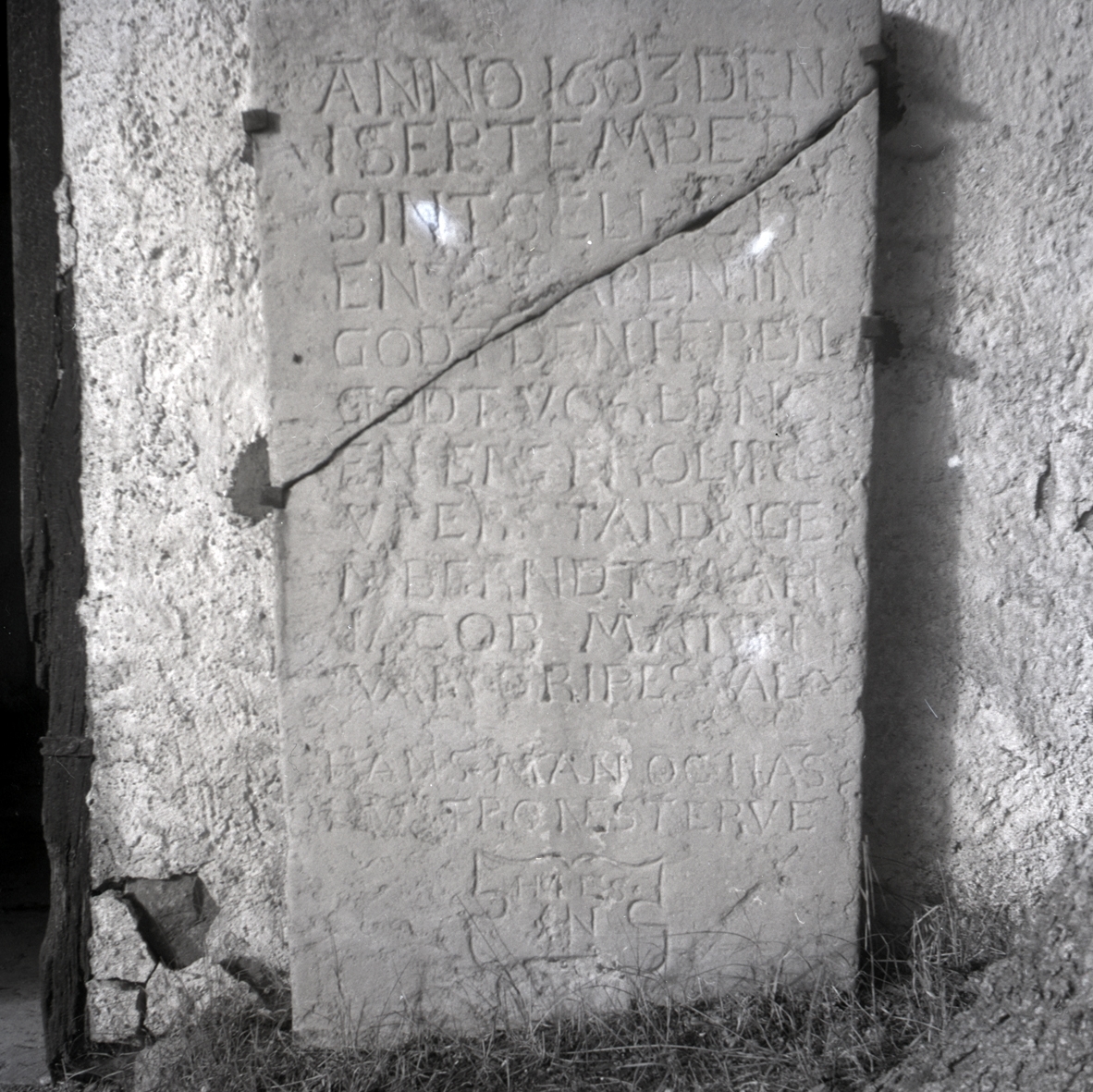 Gravsten vid stigluckans vägg. Byggmästare (Hans Mans).