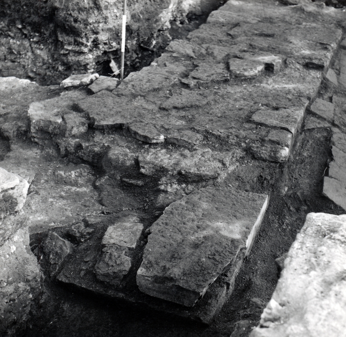 Utgrävning på Kalmar slott. Sydvästra hörnet sett mot öster vid Kalmar slott i västra vallen. Rapporten: Krutkammaren, vallgraven, västra vallen och brunnar.
