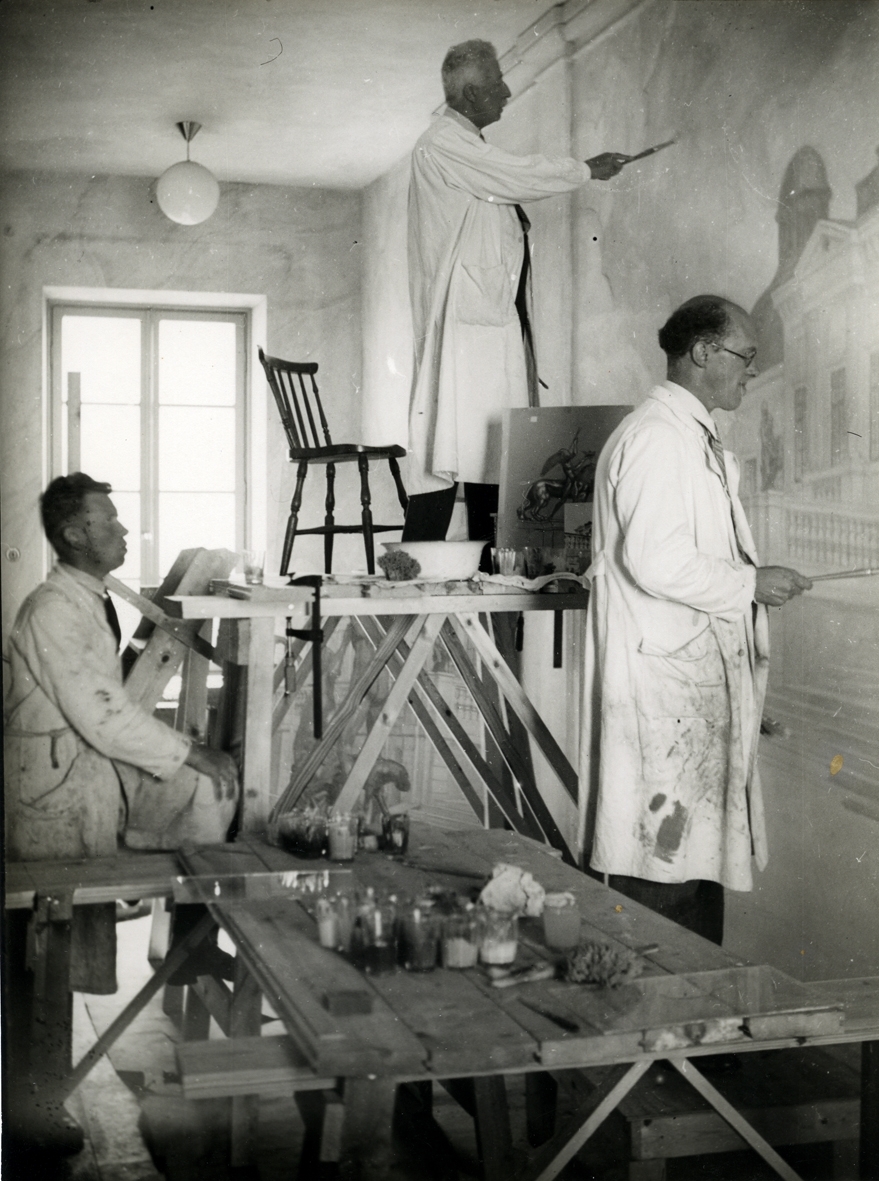 Prins Eugen med medhjälpare målar väggmålningen i Stagneliusskolans trapphus.