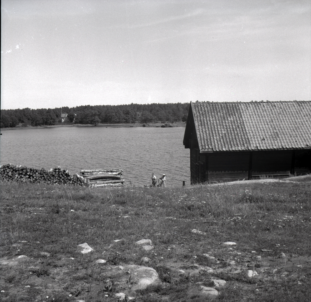 Misterhults socken, Kärrviks hamn, två kvinnor vid sjökanten, samt timmer och sjöbod.