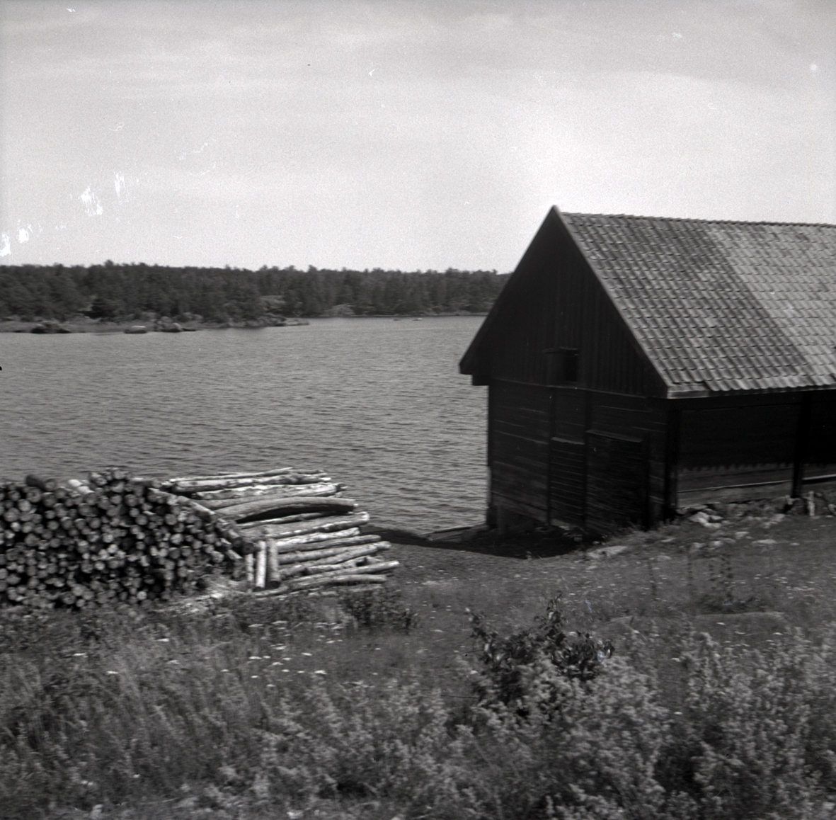 Misterhults socken, Kärrviks hamn, med timmer och sjöbod.