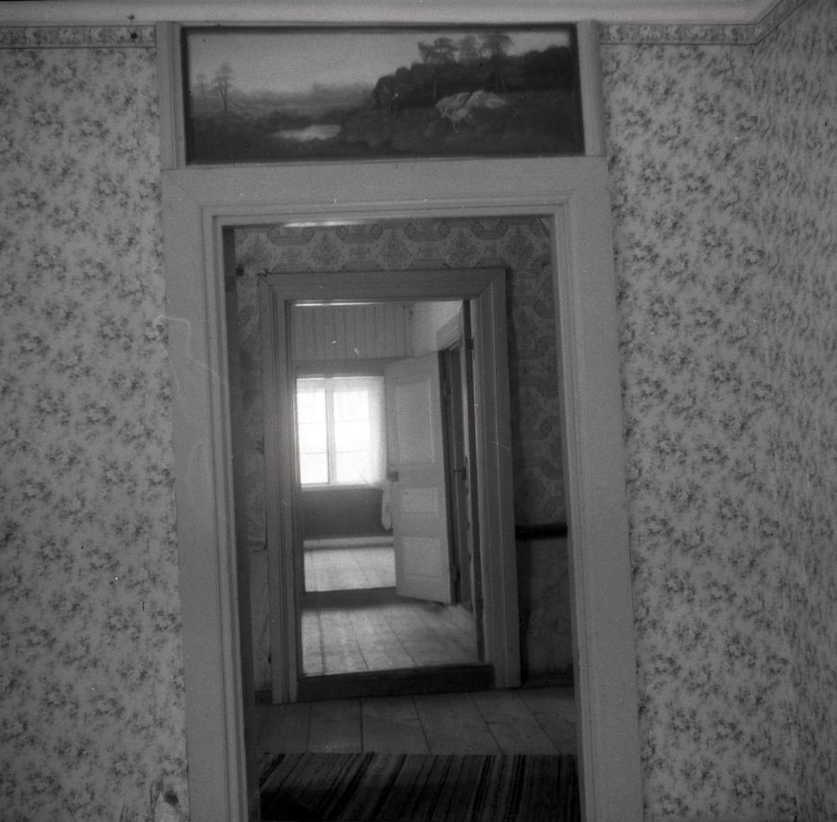 Interiör av hörnkammaren med oljemålning. I mangårdsbyggnaden på Runtorp 2.