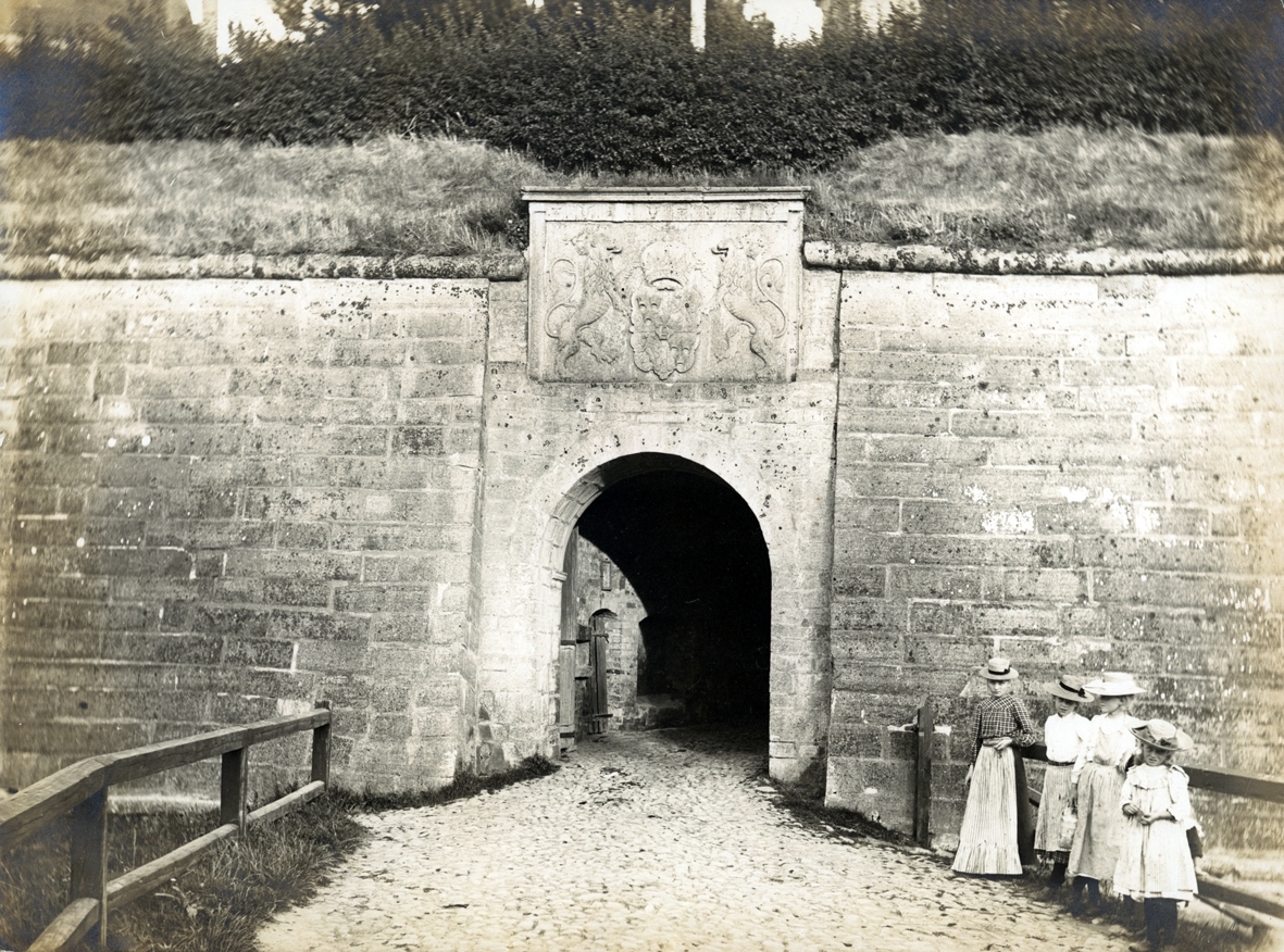 Portalen vid vallarna till Kalmar slott. Vid tiden för fotograferingen var vallgraven torrlagd och en vägbank ledde in till slottet.