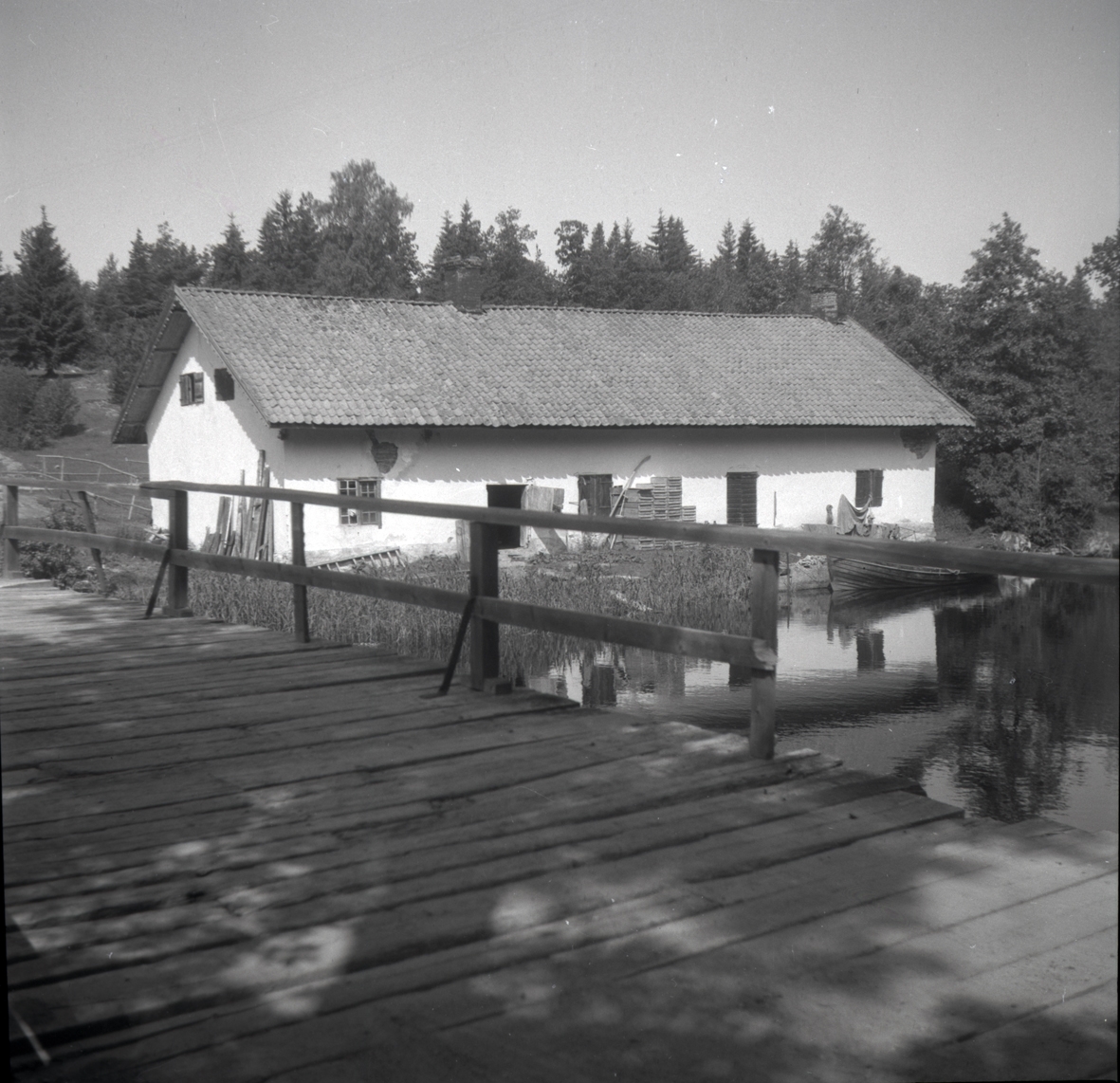 Bränneriet med vattendrag och träbro i förgrunden, i Västrum.