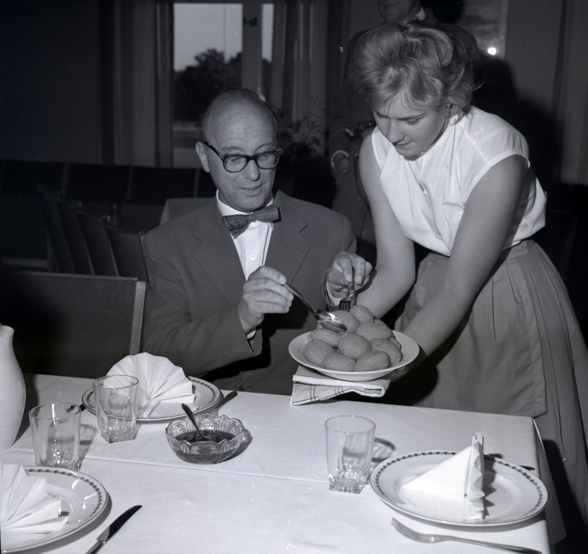 Gärdslösagården. Man som blir serverad kroppkakor.