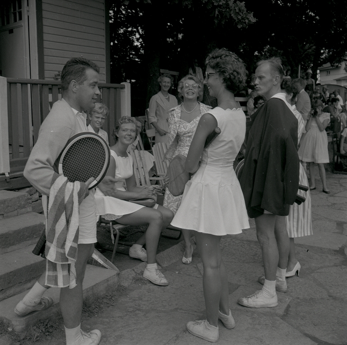 Tennisfinaler och prisutdelning en måndag. Människor vid en byggnad under sommartid.