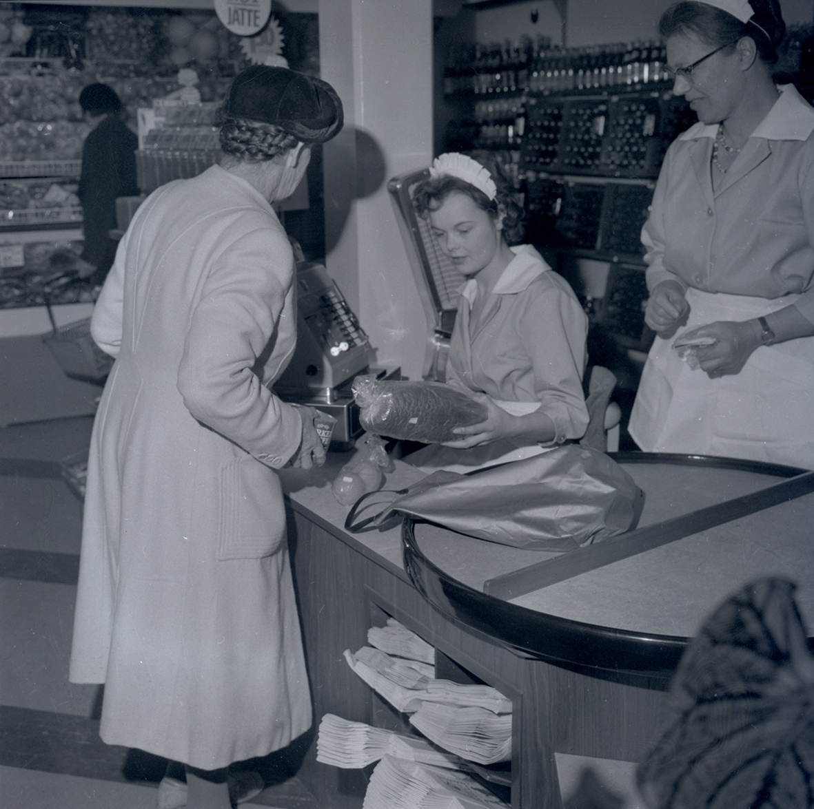 Bild tagen i samband med invigning av Konsum. Kvinnor vid kassan.