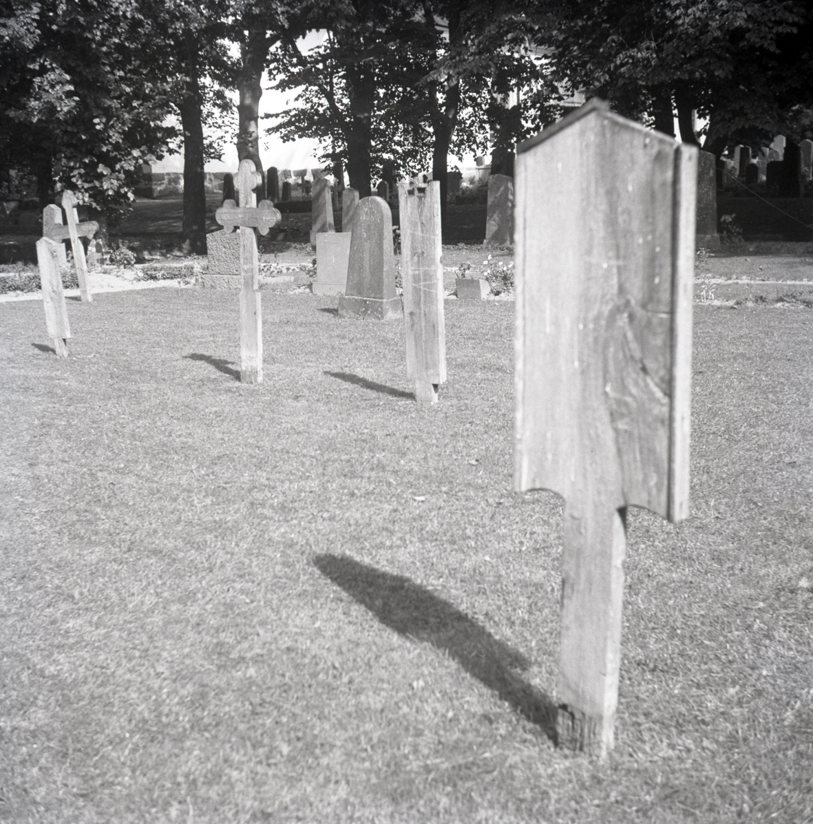 Gravvårdar i trä på Vena kyrkogård.