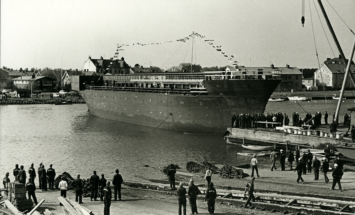 Folk som är åskådare till sjösättning av skepp på Kalmar varv.