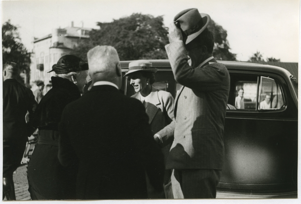 Kronprins Gustaf Adolf (till höger) och kronprinsessan Louise samt Landshövdingeparet Falk utanför färjeläget vid Ölandshamnen. 1940-talet.