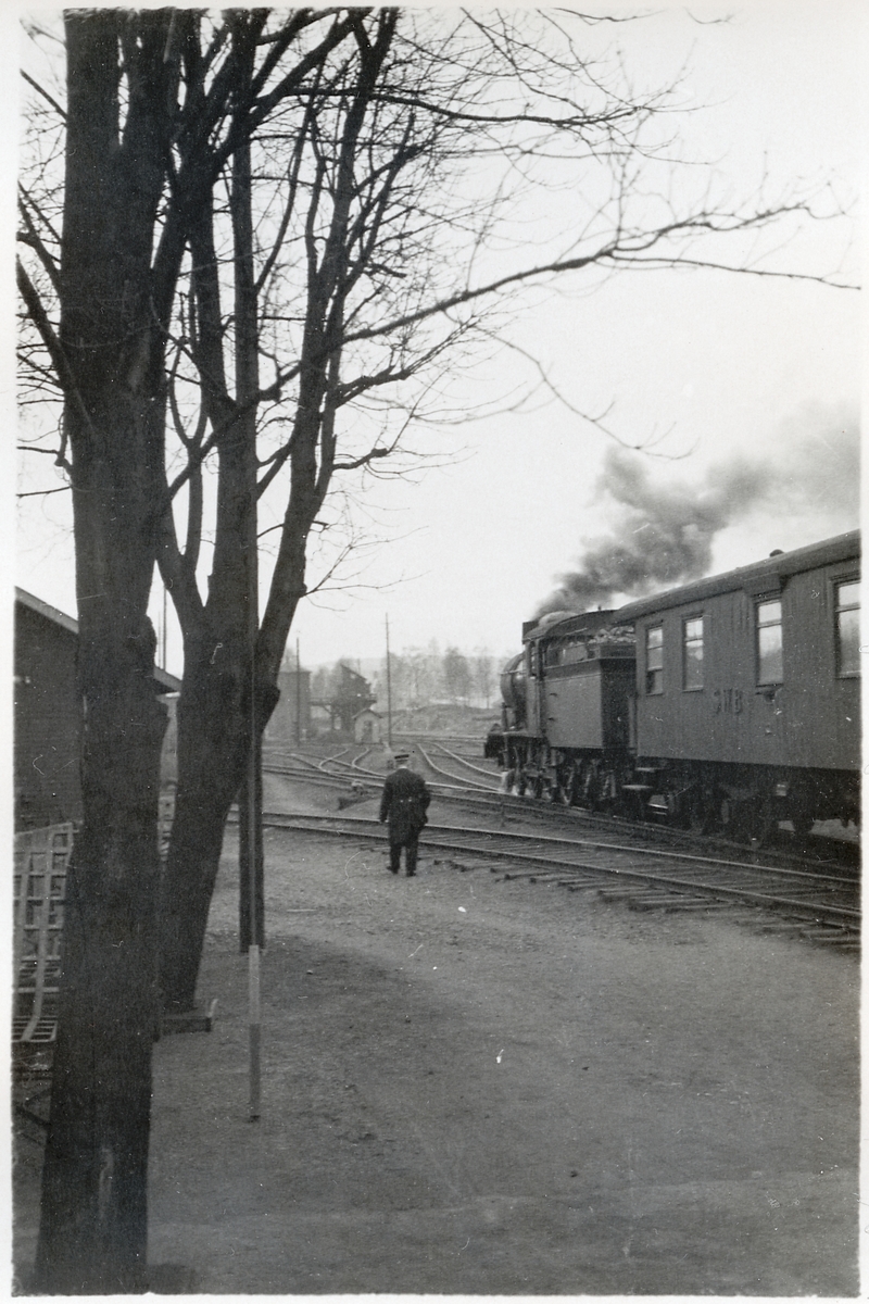 Stationsmiljö med persontåg. Bolagsnamnet på vagnen är Stockholm Västerås Bergslagens Järnväg, SWB.