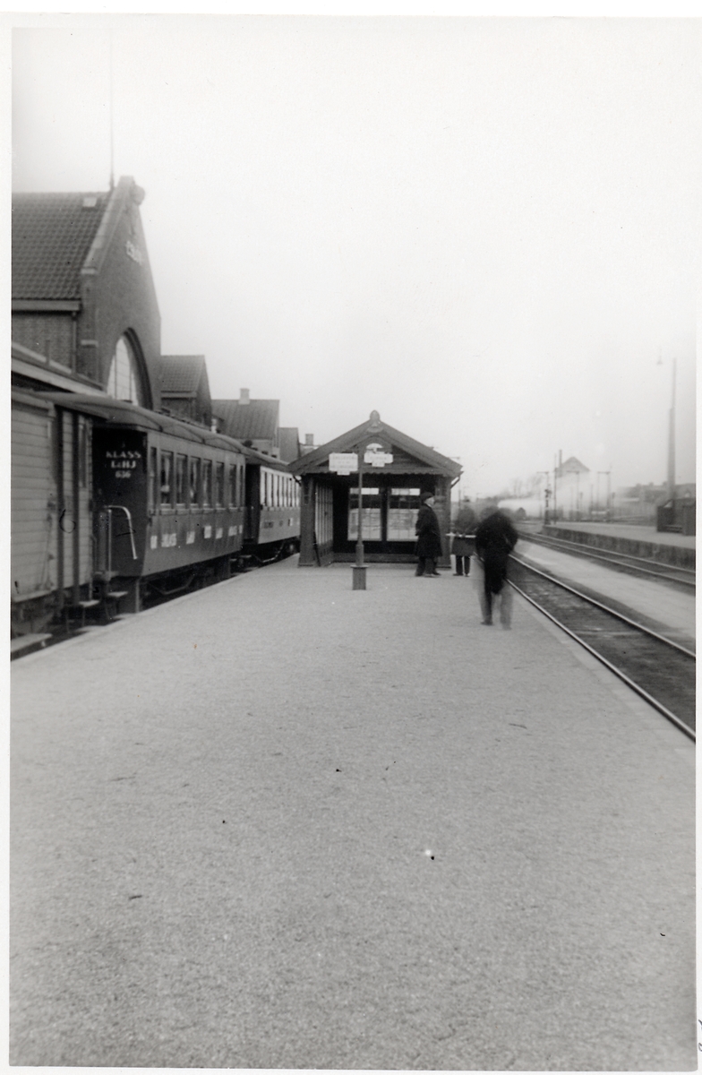 Eslöv station med planskild anslutning till perrongen genom en gångtunnel. Till vänster i bild ses Landskrona Helsingborgs Järnväg, L&HJ, Personvagn.