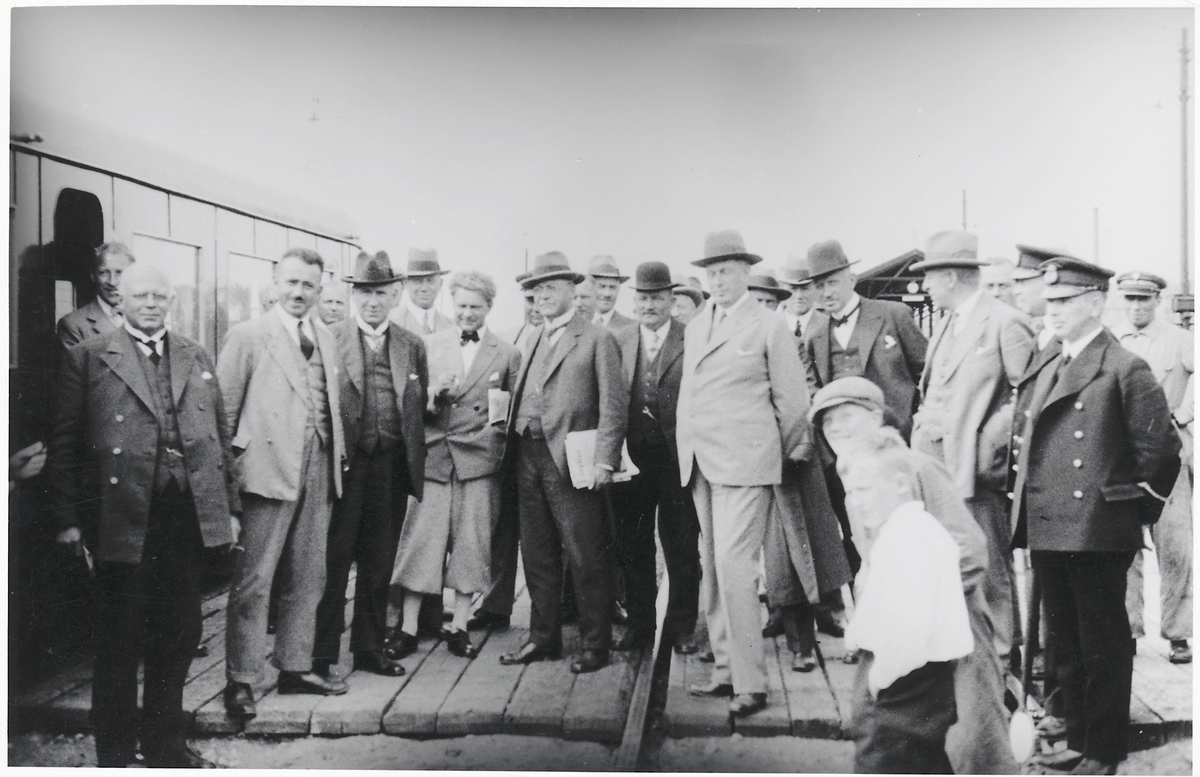 Titel: Ett grupporträtt vid stationen i samband med michelinvagnens uppvisningstur.