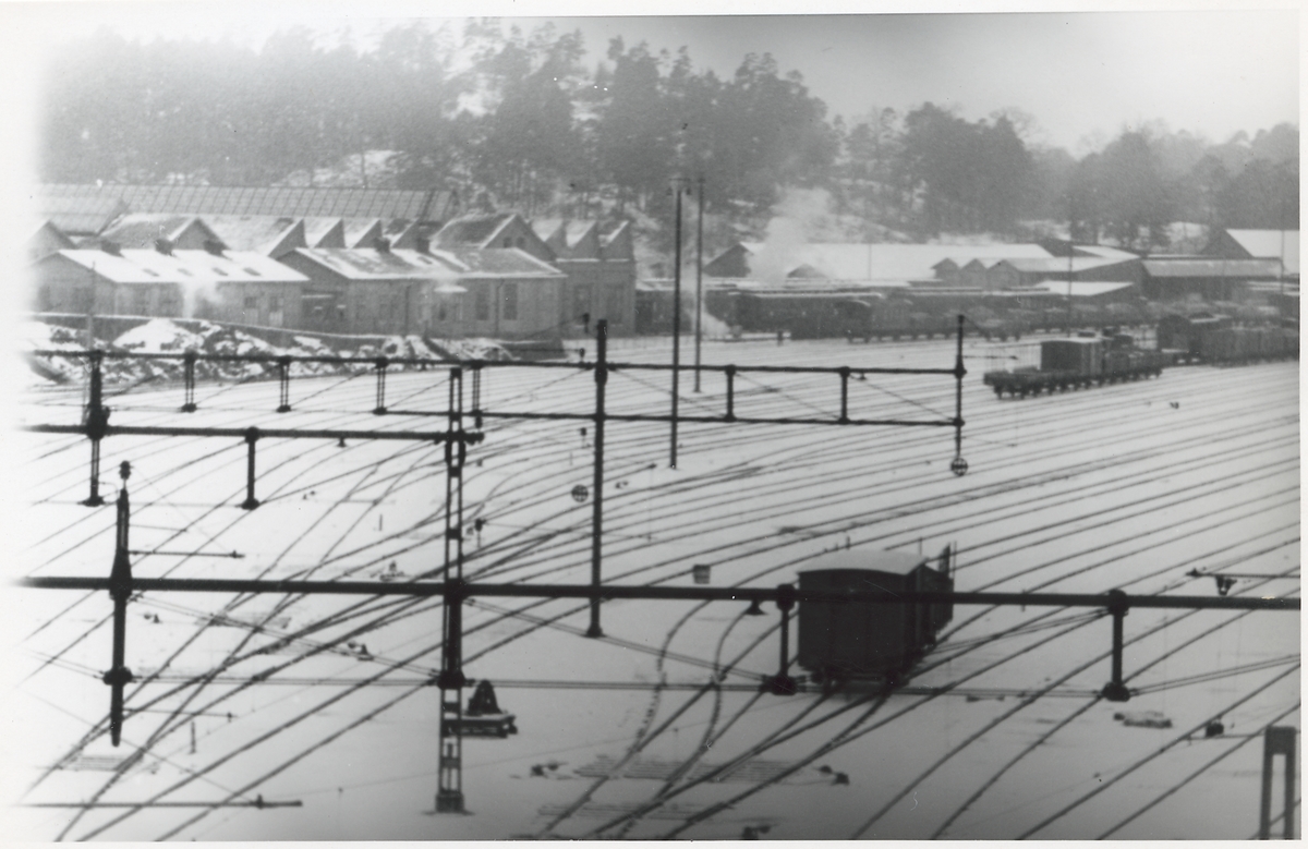 Titel: Delvis elektrifierad bangård. Tomteboda vagnverkstad till vänster.