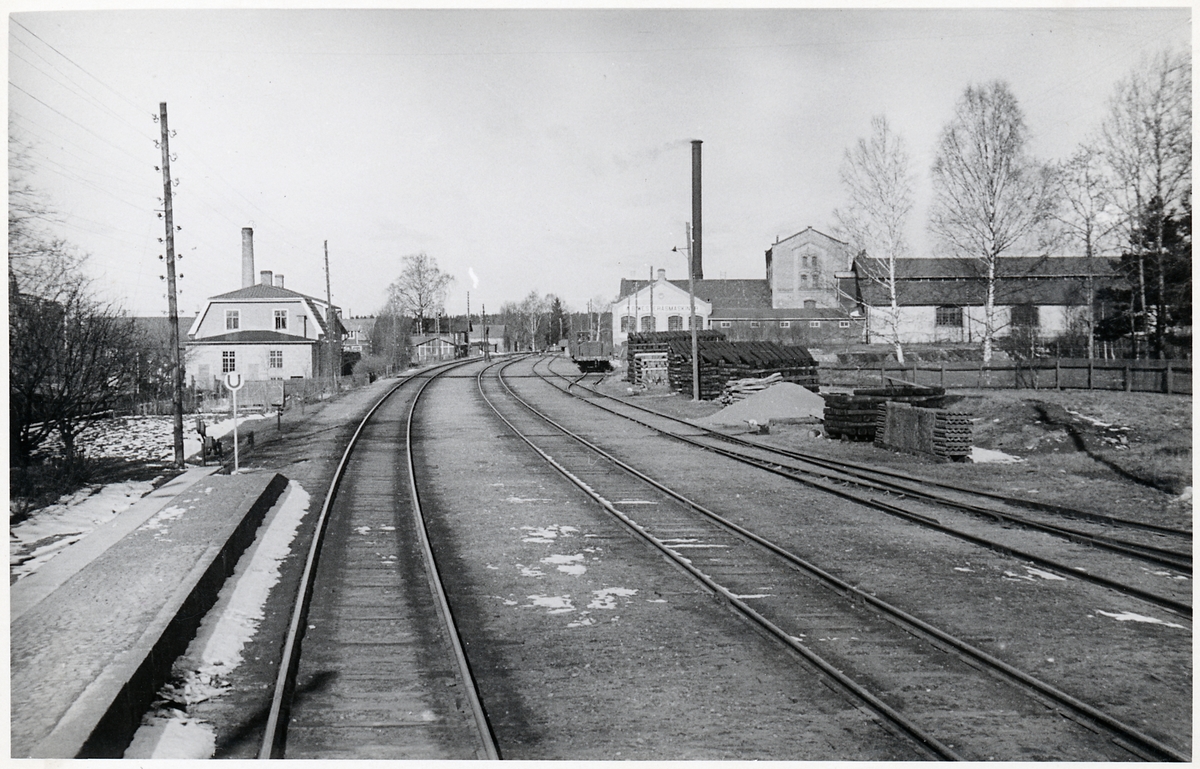 Morgongåva bangård sedd västerut. Fabriken till höger, AB Westeråsmaskiner.