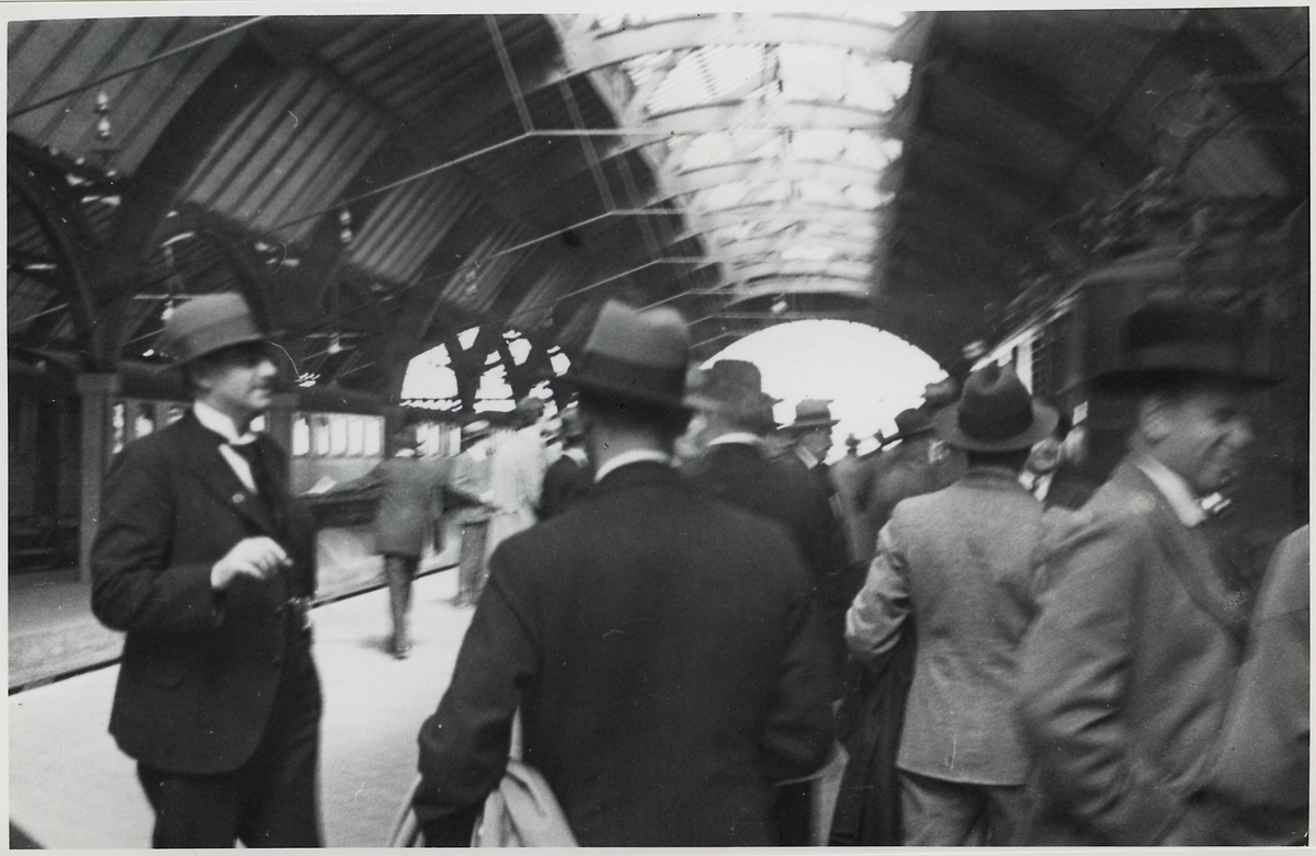 Järnvägstjänstemän på tjänsteresa, här i banhallen på Malmö centralstation.