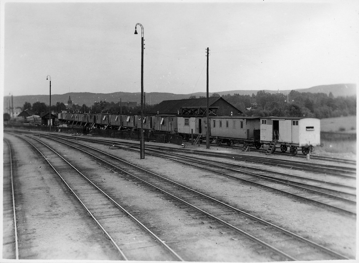 Titel: Bangård med parkerade tjänstevagnar. Använda i samband med elektrifieringsarbete.