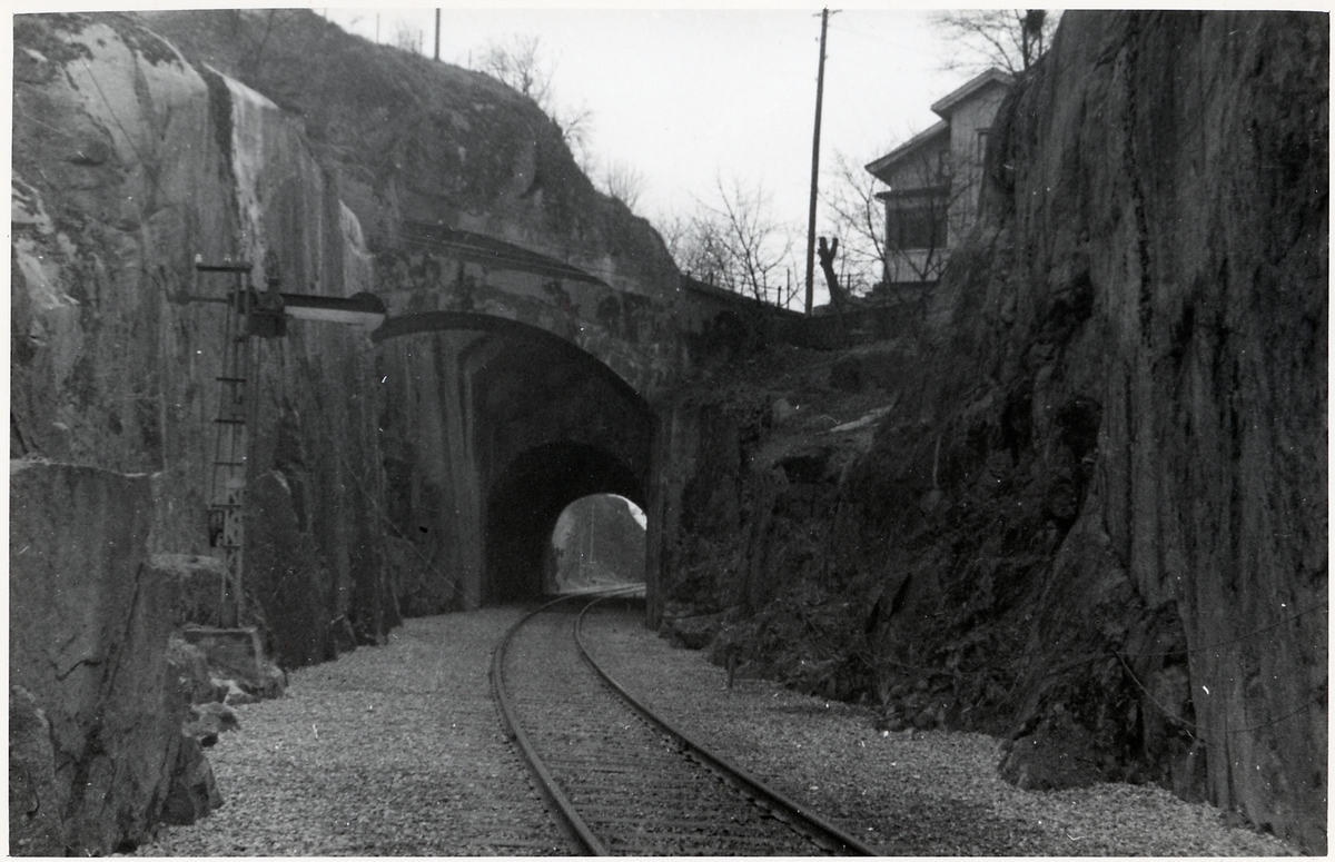 Bohusbanan, den västra av Vadbackens tunnlar, östra infarten vid vägbron vid garvarmyrvägen i Uddevalla.