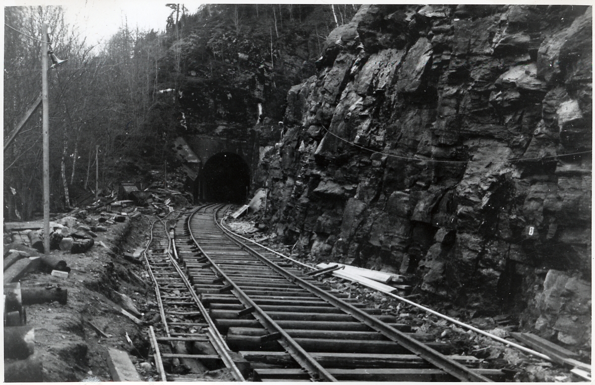 Bohusbanan, banarbete vid norra infarten till Buatunneln på linjen mellan Stenungsund och Ljungskile. Decauville spårsystemet användes som provisorisk bana under arbetet.