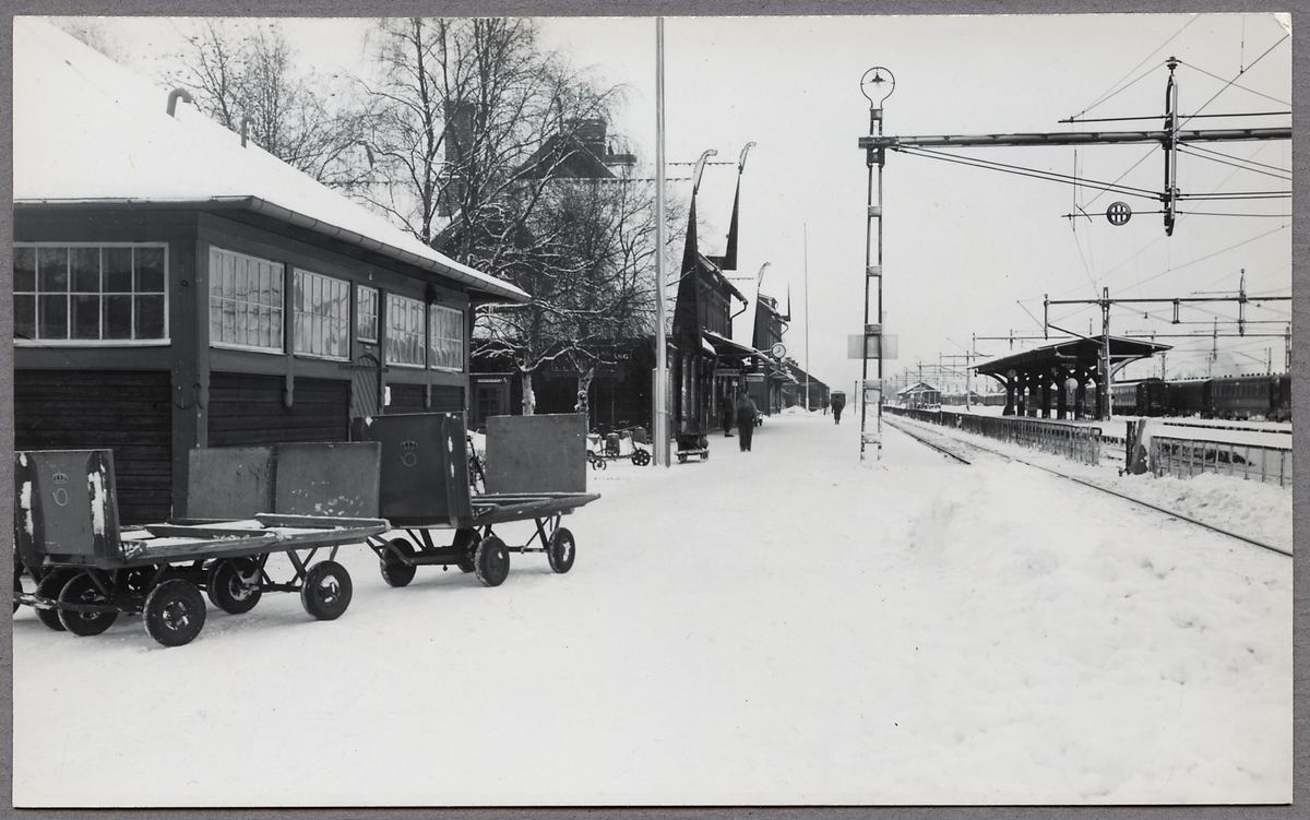 Titel: Boden Centralstation. Längst fram i bild ses kärror med postens emblem.