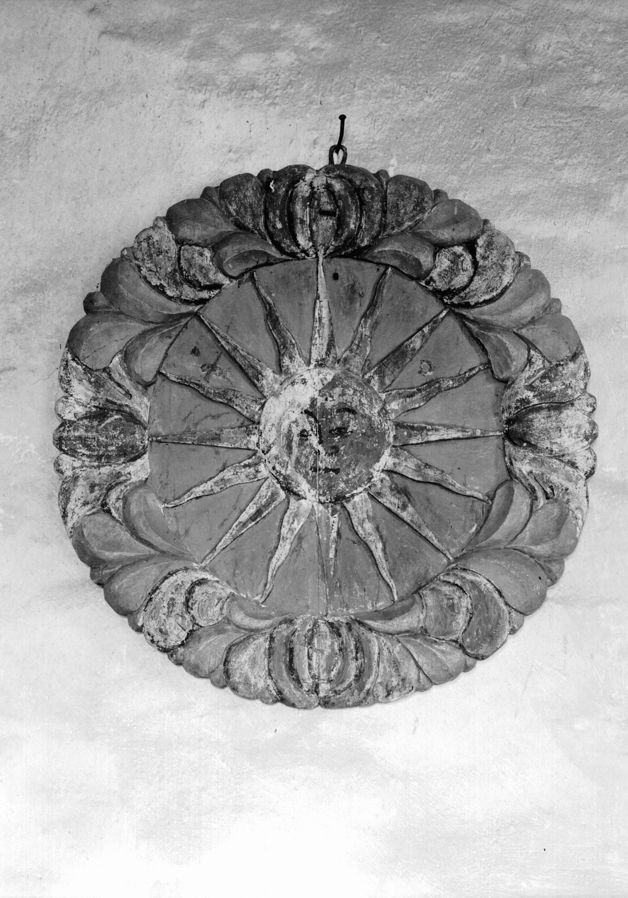 Sol. Rund skiva av trä. Inom ring av röda och förgyllda blad en sol med ansikte, från vilket strålar utgå, mot blå botten. 1600-talet.