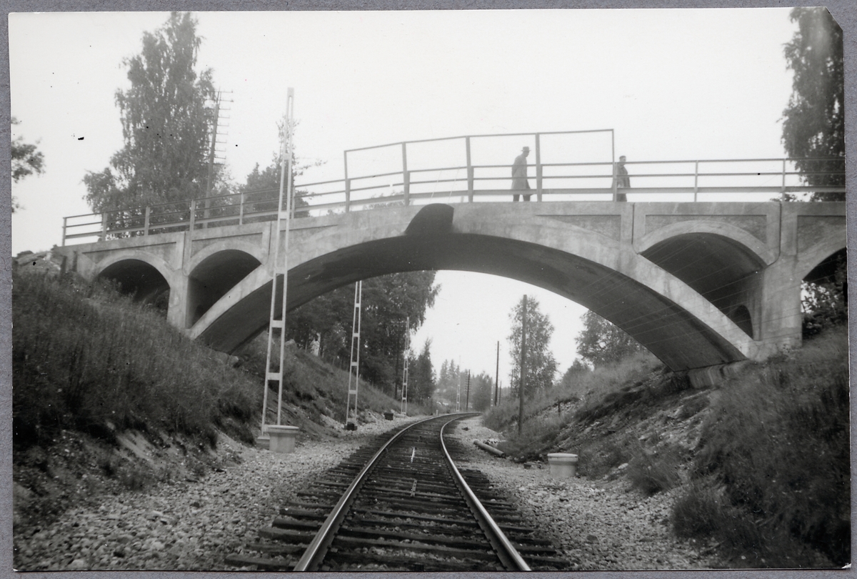 Vägbro på linjen mellan Söderhamn och Sundsvall C. Kontaktledningsstolparna är uppsatta inför elektrifieringen 1955-56.