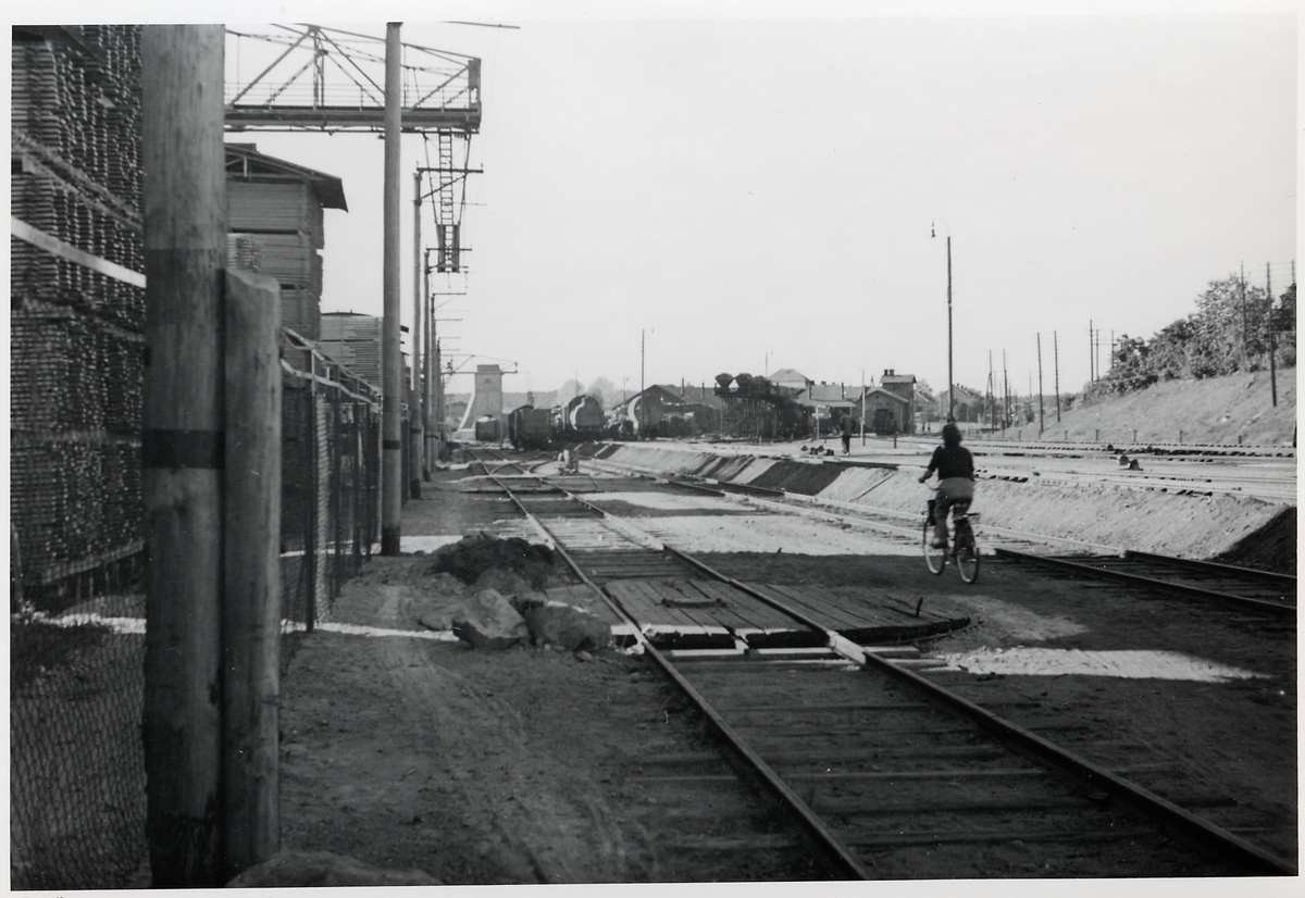 Bangårdsområde, kolbrygga och lokstall i fonden. Vy mot Söderhamn.