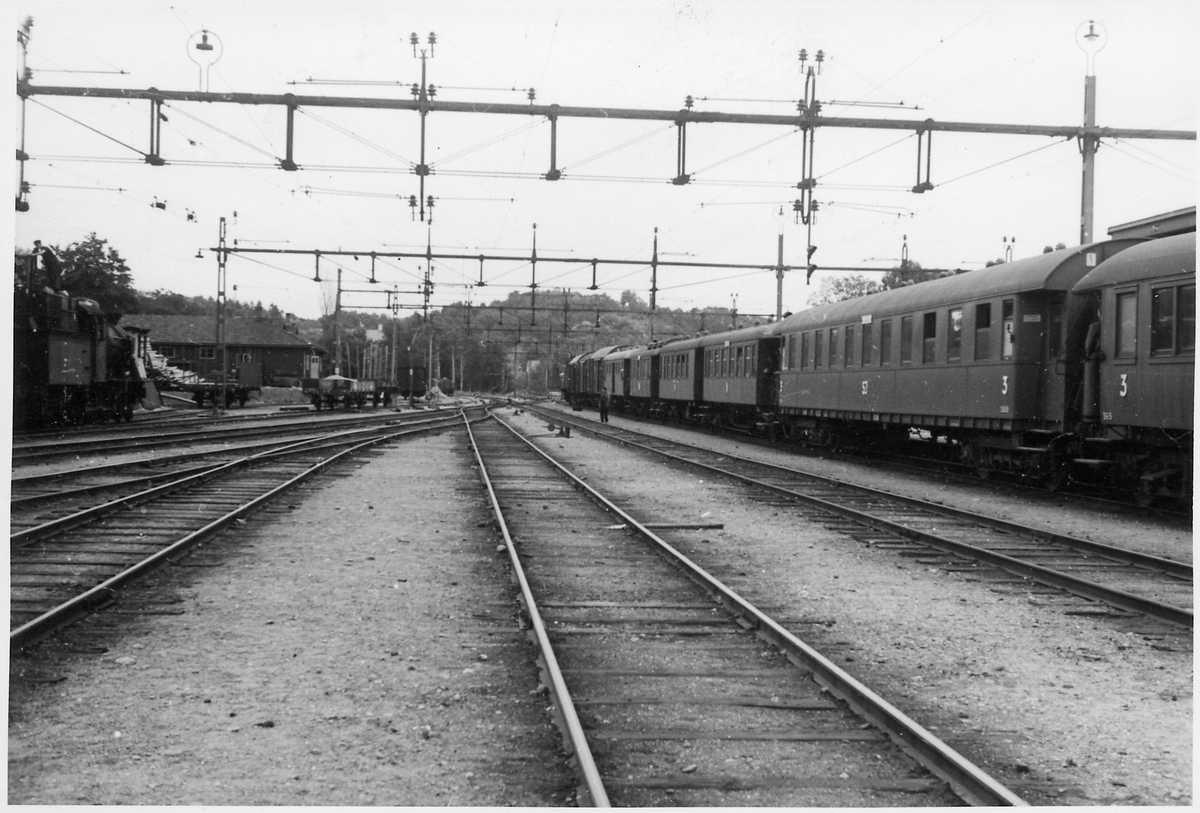 Uddevalla, sett mot Vänersborg. Statens Järnvägar, SJ personvagn klass 3.