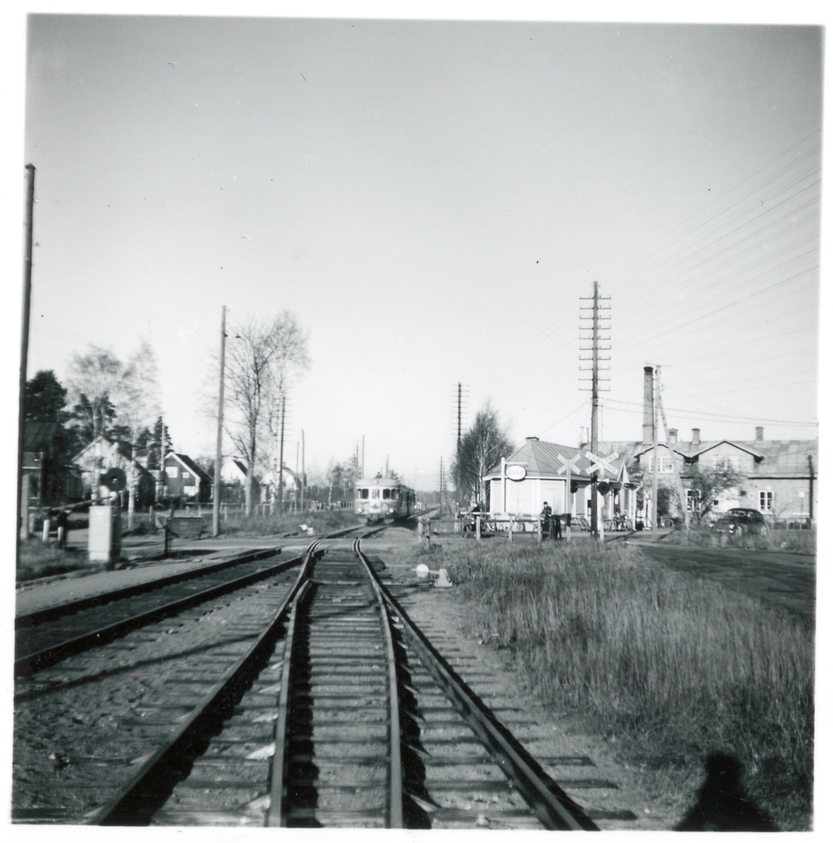 Järnvägsövergång i Rosenfors, inkommande rälsbuss vid Esso macken.