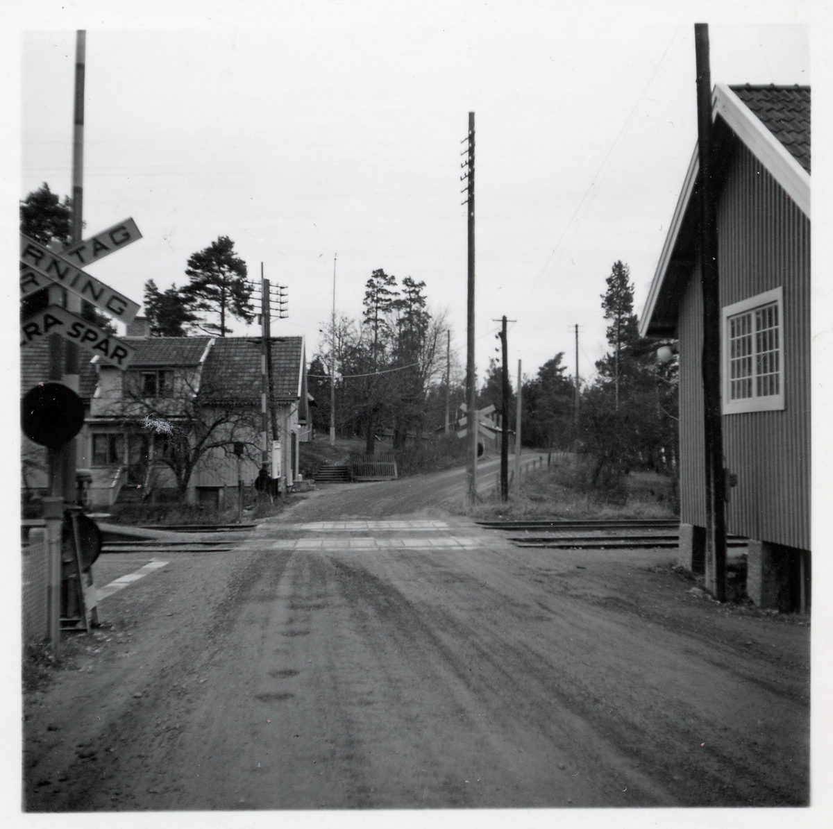 Titel: Järnvägsövergång i Forshult med magasin till höger.