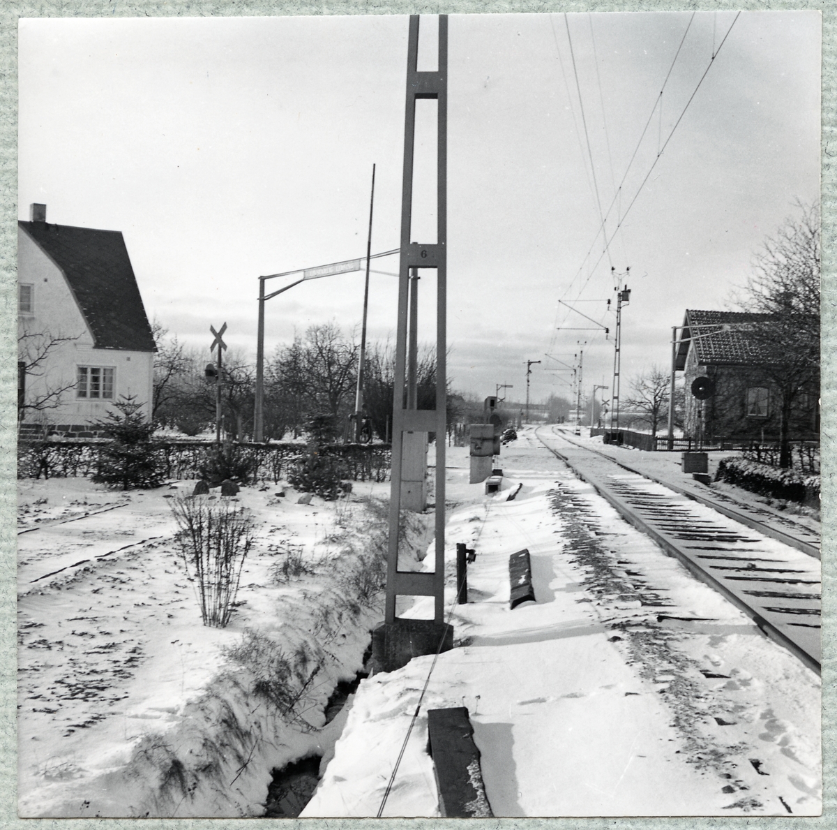 Titel: Järnvägsövergång väster om stationen. Byggnaden till höger är en gammal banvaktstuga.