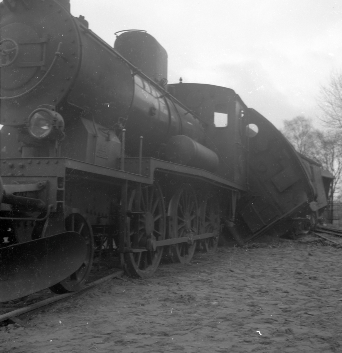 Här syns ånglok HNJ lok 28, den urspårade tendern och resgodsvagn HNJ F3 761.