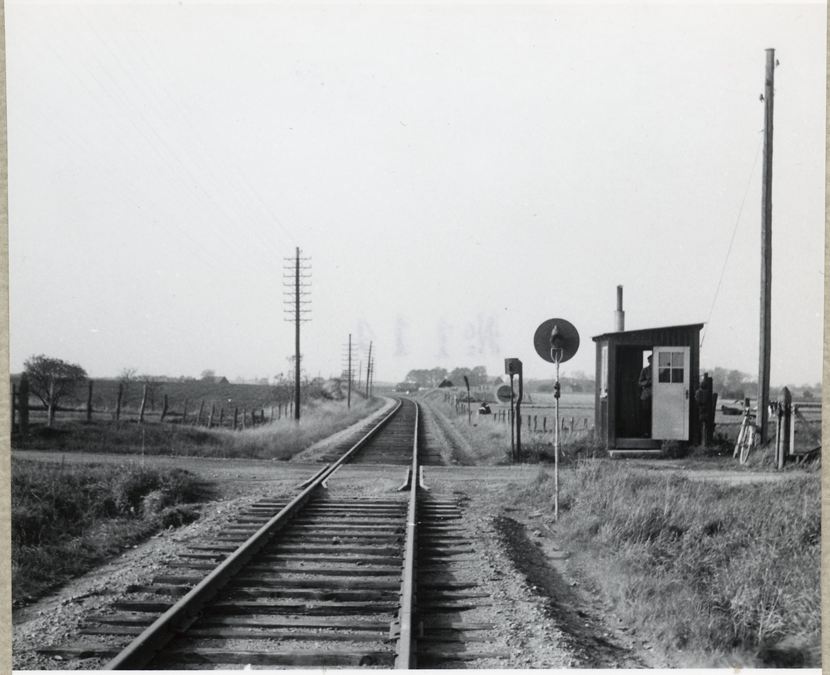 Titel: Järnvägsövergång med vaktkur vid Orås på linjen mellan Askeröd och Bjärsjölagård.
