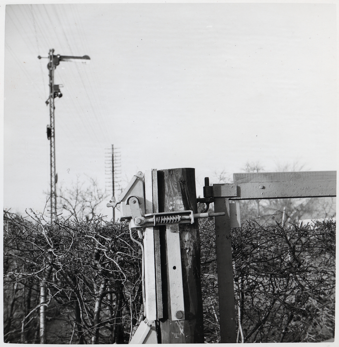 Del av vägbom vid järnvägsövergången vid Lokstallsvägen i Sjöbo, på sträckan mellan Veberöd och Sjöbo.