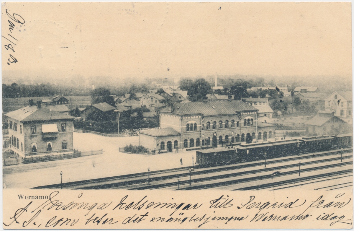 Wernamo station. Halmstad-Nässjö Järnväg, HNJ. Första stationshuset byggdes 1877 och revs 1995. för att det stod i vägen för en planerad vägkorsning. Första lokstallet byggdes 1875 men revs 1894 och ett nytt byggdes på annan plats på bangården. Ett nytt stationshus byggdes 1899 av Skånes-Smålands Järnväg, SSJ men byggnaden användes aldrig som järnvägsstation då SSj och HNJ enades om att använda HNJ station. 1902 byggdes ett nytt gemensamt stationshus vid godsmagasinet. 1903 anslöts Borås- Alvesta, BAJ hit och då byggdes ett nytt godsmagasin som bekostades av BAJ. Detta magasin tillbyggdes 1918 och 1935. HNJs gamla stationshus flyttades 1902 och blev bostads- och överliggningshus.
