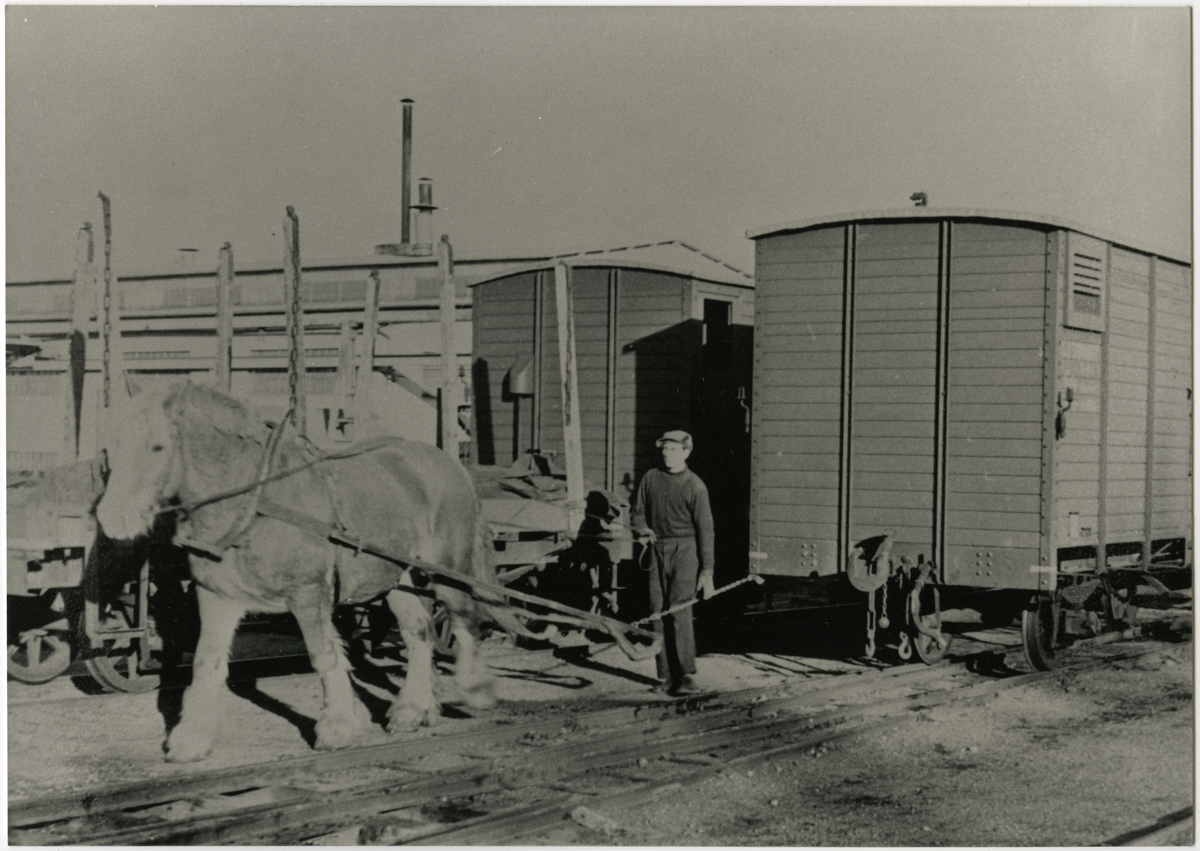 Titel: Växling av vagnar med häst vid Ödeshög järnvägsstation.