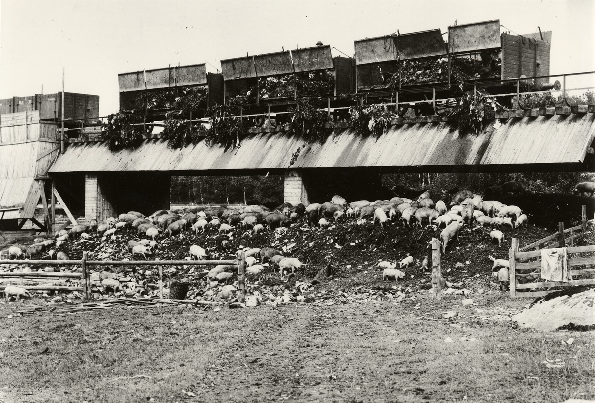 Titel: AB Särimners grisar i Lövsta äter sopor 1898. SLJ vagnar.