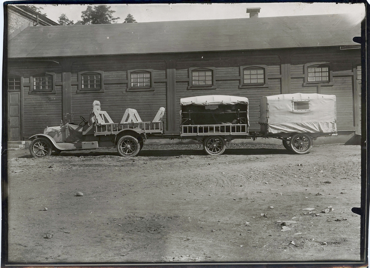 Titel: Bil med släp vid godsmagasin.