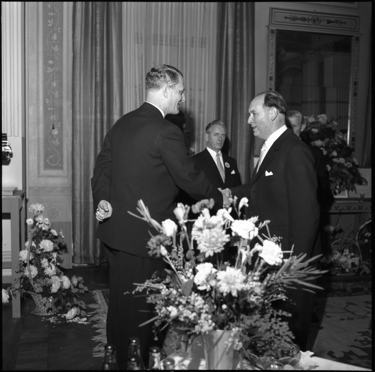 Generaldirektör Erik Upmark tar emot gåvor från Sydkraft, VEGETE-bolagen, SAL, Sv. Turisthot Riksförbund.