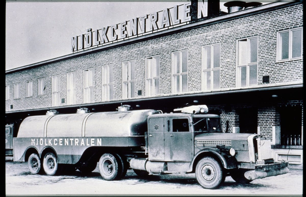 Titel: Gengasdriven tankbil utanför mjölkcentralen.