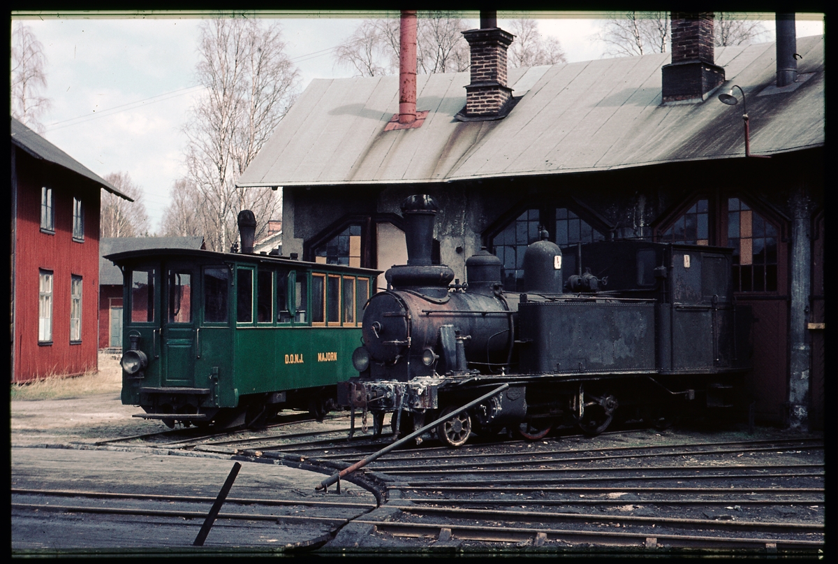 Titel: DONJ ångvagn "MAJORN" samt DONJ lok 13 vid Jädraås lokstall. Dala-Ockelbo-Norrsundets Järnväg.