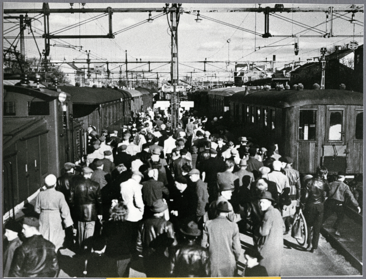 Titel: Resande på Eskilstuna Centralstation som ska med "arbetartåget" i juni 1955.