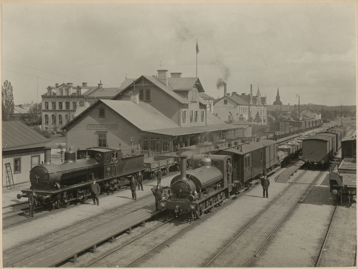 Oxelösund - Flen - Västmanlands Järnvägar, OFWJ U2 4 till höger samt OFWJ K 19 till vänster på Eskilstuna Central 1899.