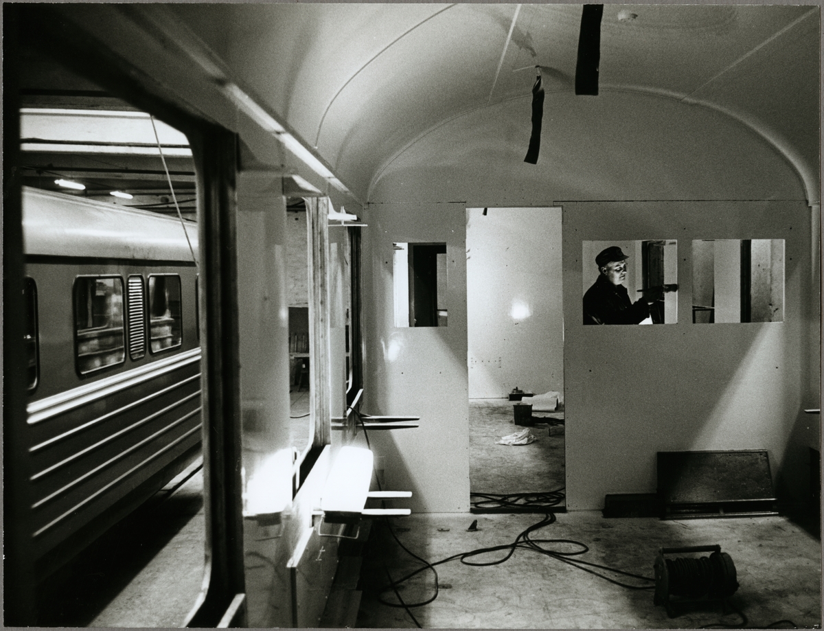 En vagn målas av Erik Andersson i Trafikaktiebolaget Grängesberg - Oxelösunds Järnvägar, TGOJ verkstad, Eskilstuna.